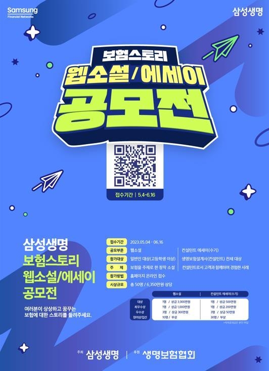 (조세금융신문=김종태 기자) 삼성생명은 3일 생명보험협회와 함께 생명보험과 컨설턴트 업에 대한 가치를 알리기 위해 보험을 주제로 한 '보험스토리 웹소설 및 에세이 공모전'을 개최한다고 밝혔다.