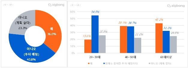 8일 직방은 지난달 18일부터 이달 2일까지 직방 어플리케이션 내 접속자 대상, 모바일 설문을 진행한 결과, 응답자 726명 가운데 40.8%는 현재 보유한 부동산은 없지만 투자할 예정이라고 답했다고 밝혔다.