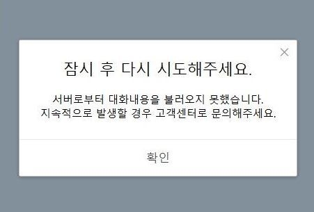 PC버전에서 톡방을 열 경우 '잠시 후 다시 시도해주세요. 서버로부터 대화내용을 불러오지 못했습니다. 지속적으로 발생할 경우 고객센터로 문의해주세요'라는 팝업창이 떴다. PC뿐 뿐만 아니라 모바일에도 새로운 대화 내용이 업로드 되지 않는 카톡 오류가 발생해 큰 불편을 야기했다.
