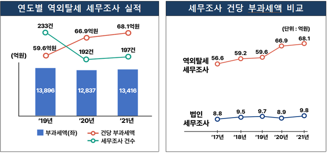 건당 부과세액도 2021년 기준 68.1억원에 달하는 등 일반 기업 세무조사보다 7배 가량 높다.