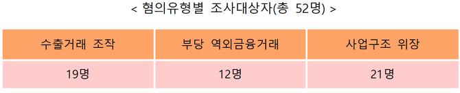 현지법인을 이용하여 수출거래를 조작한 수출업체는 19명으로 사주 자녀가 소유하는 페이퍼 컴퍼니를 수출거래에 끼워넣어 이익을 챙기거나 수출대금을 사주가 빼돌려서 유용한 혐의를 받고 있다.