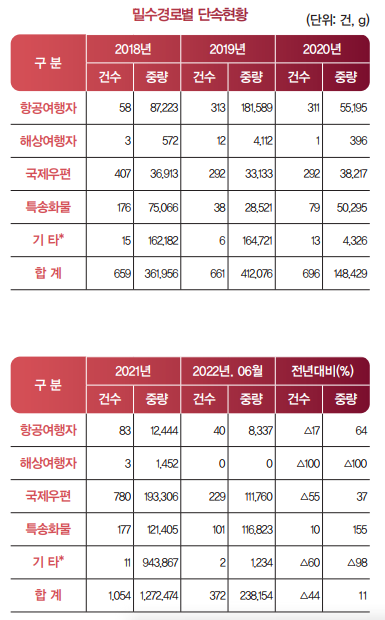 뿐만 아니라 마약이 단속된 건수도 2018년 659건, 2019년 661건, 2020년 696건 수준에서 2021년에는 1054건으로 약 50% 이상 급증하게 되었다. 단속된 마약류의 중량은 2020년 148.4kg에서 2021년 1,272.4kg으로 약 8.5배 이상 증가하였다.