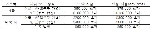 미국 국세청은 납세자의 해외금융계좌 정보수집과 역외 탈세방지를 목적으로 제정된 해외금융계좌신고법(FACTA, Foreign Account Tax Compliance Act)에 따라, 일정 금액을 넘는 해외금융계좌가 있는 미국인(거주자, 법인 포함)에게 해외금융계좌 신고를 요구한다. 아래에 해당되는 미국인은 해외의 모든 금융계좌를 파악하여 신고하여야 한다.
