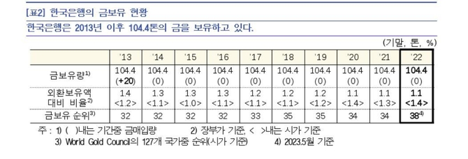 한은은 6일 발표한 '보유 금(金) 관리 현황과 향후 운용 방향' 보고서에서 "외환보유액 내 금 비중 확대가 긴요한지에 대해 신중한 접근이 필요하다"며 "작년 외환보유액은 외환시장 안정화 조치로 400억달러 감소했는데, 단기간 내 이전 수준을 회복하기 어렵고 글로벌 경기침체, 지정학적 리스크 등이 잠재된 상황서 금 확대보다는 달러화 유동성을 충분히 공급하는 게 나은 선택"이라고 판단했다.