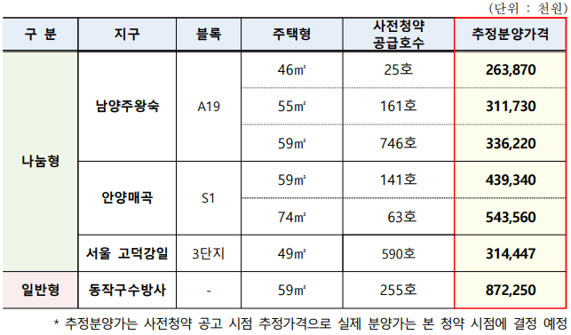 추정분양가는 나눔형(시세 70% 이하로 공급하되, 되팔 때 차익의 70%만 갖는 형식)인 남양주왕숙 2억6400만원~3억3600만원, 안양매곡 4억3900만원~5억4300만원, 고덕강일 3단지 3억1400만원이다. 일반형인 수방사는 전용면적 59㎡이 8억7200만원으로 산출됐다.