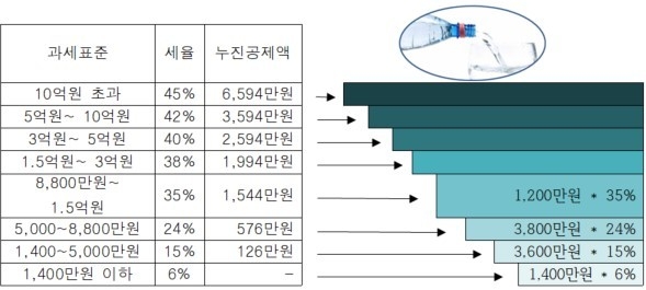 물통은 사람마다 1년에 1개밖에 없어서 모든 소득을 이 물통에 넣어야 한다. 따라서 이미 1억원 어치의 물이 차있기 때문에 1,000만원은 그 위에 더 채워지는 것이다. 그렇기 때문에 1000만원은 전액 35%의 세율이 적용된다.