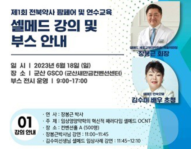 대표 장봉근 박사는 '임상영양약학의 혁신적 패러다임 셀메드 OCNT'를 주제로 특강하고, 전속모델인 군산 출신 배우 김수미는 임상 사례를 설명한다.