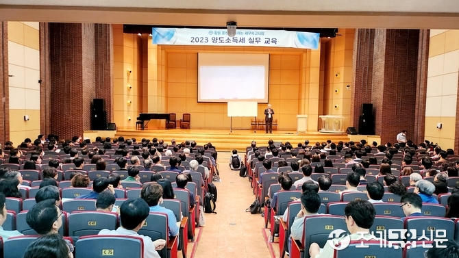 (조세금융신문=이지한 기자) 한국세무사고시회가 주최한 '2023 양도소득세 실무 교육'이 14일 오전 10시 한국교회100주년 기념관 글로리아홀에서 열려 700여명의 회원이 강의장을 찾았다.
