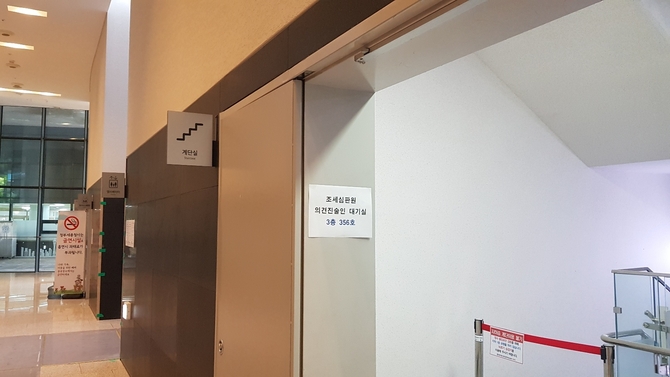 청사 안내 직원에게 출입증을 받고 게이트를 넘어가면 바로 복도에 심판정으로 올라가는 엘레베이터 안내판이 있다. 3층 356호가 납세자의 목적지다.