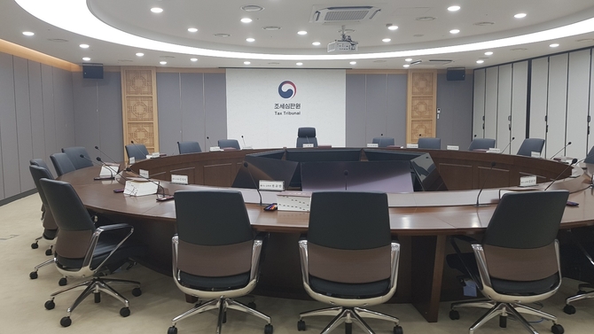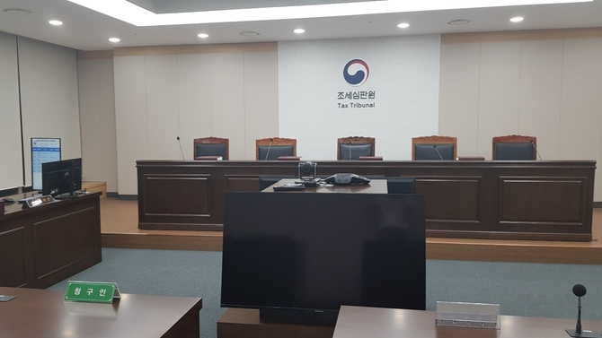 소심판정에 들어가면 심판정 상단에 심판관들이 배석하고 아랫단 왼쪽과 오른쪽에 각각 납세자와 처분청이 자리잡는다.