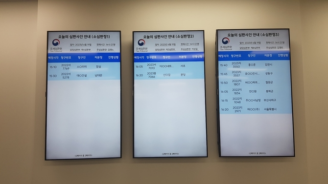안내판은 법원에서 사용하는 것과 똑같다. 시간, 사건번호, 청구인(이름을 가린), 처분청이 표시된다.