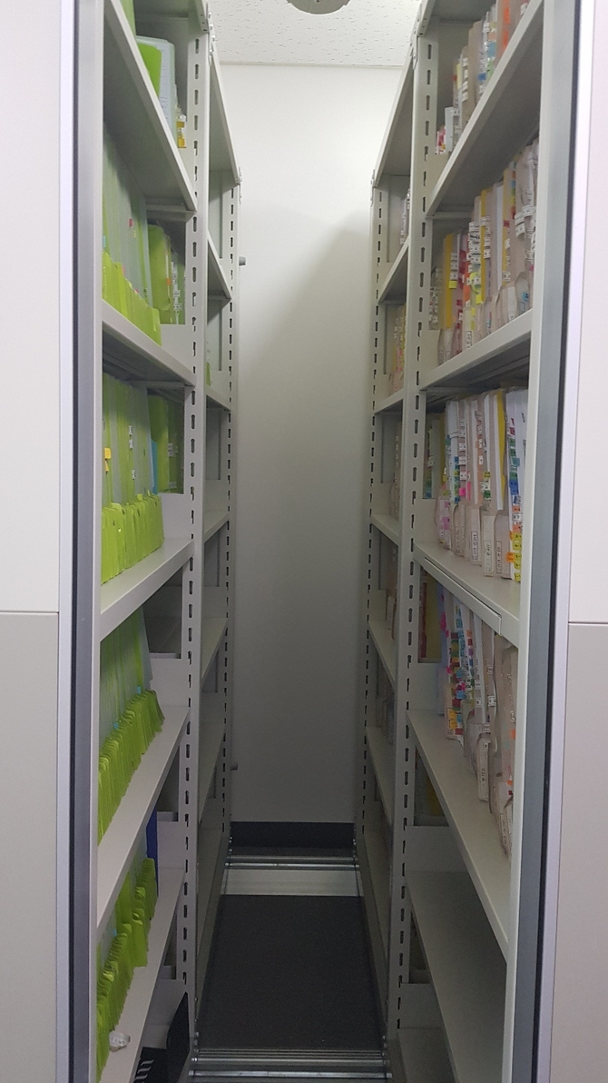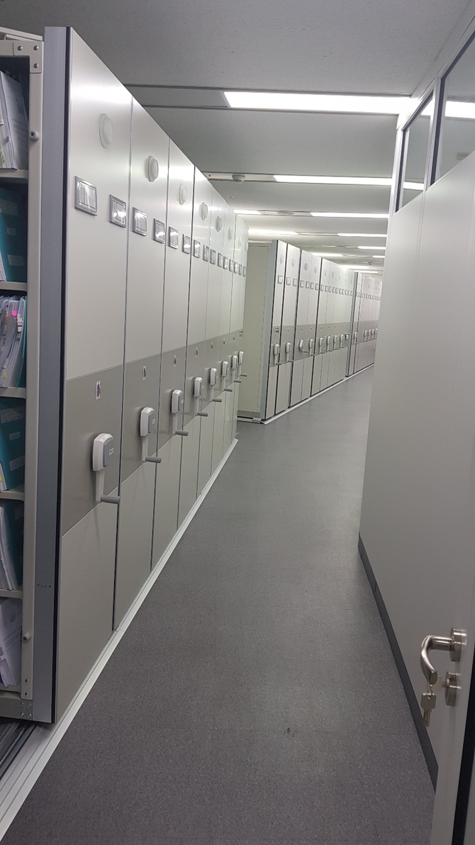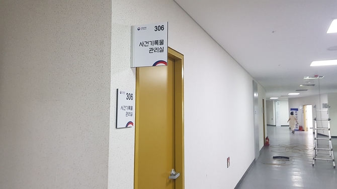조세심판원 서고는 긴 복도로 되어 있으며 복도 왼편에 있는 이동형 책장들 안에 사건기록이 차곡차곡 정리돼 있다.