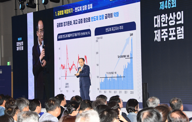 삼성전자와 SK하이닉스가 최근 조 단위의 반도체 적자를 내는 등 우리나라 수출의 20%를 차지하는 반도체 산업이 고전하는 것과 관련, "반도체 경기가 바닥을 치는 때가 진행되고 있고 지금은 거의 바닥을 다지는 수준"이라며 "수출도 앞으로 개선될 것"이라고 전망했다.