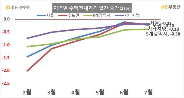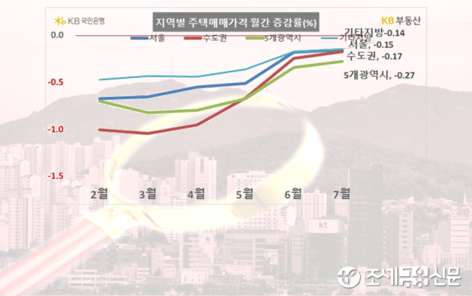 지방 5개 광역시(-0.27%)와 기타지방(-0.14%)도 전달보다 하락했지만, 전국적으로 보면 매매가격 하락 폭은 전달 대비 축소되는 추세라고 KB부동산은 설명했다.