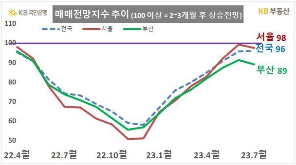 서울의 매매가격 전망지수는 전국보다 높은 98이었다. 경기도는 102로, 전월(101)에 이어 100을 넘었다.