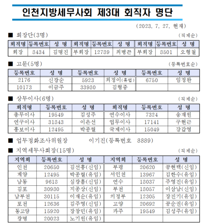 이날 임명된 고문, 상무이사, 정화위원장, 지역세무사회장, 이사, 위원회 위원장 등 명단은 다음과 같다.