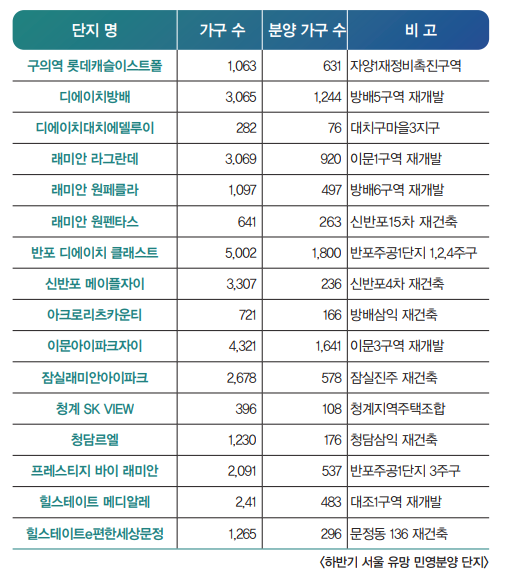 하반기 서울 유망 민영분양 단지의 경우 ▲구의역 롯데캐슬이스트폴(자양1재정비촉진구역, 1063가구) ▲디에이치대치에델루이(대치구마을3지구, 282가구) ▲래미안 라그란데(이문1구역재개발, 3069가구) ▲이문아이파크자이(이문3구역 재개발, 4321가구) ▲힐스테이트 메디알레(대조1구역재개발, 2451가구) ▲청계 SK VIEW(청계 SK VIEW, 396가구) ▲디에이치방배(방배5구역 재개발, 1097가구) ▲래미안 원페를라(방배6구역재개발, 1097가구) ▲래미안원펜타스(신반포15차재건축, 641가구) ▲반포 디에이치 클래스트(반포주공 1단지 1·2·4주구, 5002가구) ▲신반포 메이플자이(신반포4차 재건축, 3307가구) ▲아크로리츠카운티(방배삼익 재건축, 721가구) ▲잠실래미안아이파크(잠실진주, 2678가구) ▲청담르엘(청담르엘, 1230가구) ▲프레스티지 바이 래미안(반포주공1단지 3주구, 2091가구) ▲힐스테이트e편한세상문정(문정동 136 재건축, 1256가구)가 꼽힌다.