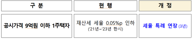 (조세금융신문=고승주 기자) 정부가 공시가격 9억원 이하 1주택에 대한 재산세 인하 특례를 3년 더 연장한다.