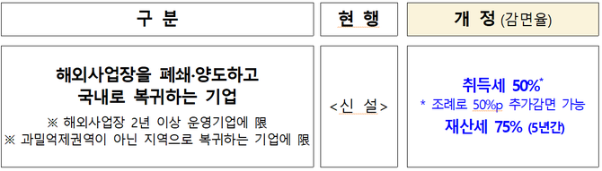 국내 복귀 직후 해외사업장을 완전히 처분하지 않더라도 국내 사업장 신‧증설하기만 하면 적용하나, 거짓 복귀를 차단하기 위해 해외사업장 유지(생산량 25% 감축) 기업은 적용에서 제외한다.