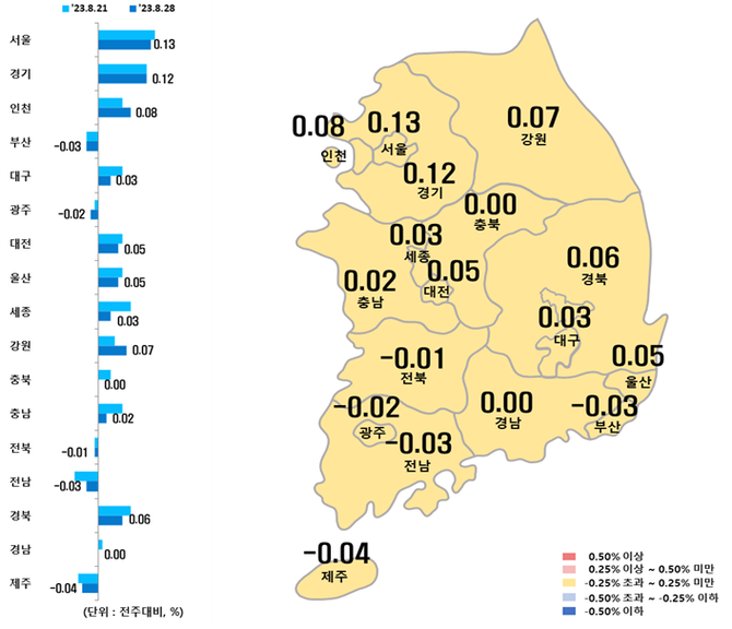 경기도는 화성시(0.58%), 하남시(0.41%), 성남 수정구(0.34%) 등이 높은 상승률을 보인 반면, 동두천시(-0.14%), 남양주시(-0.07%), 김포시(0.04%) 등은 하락했다.