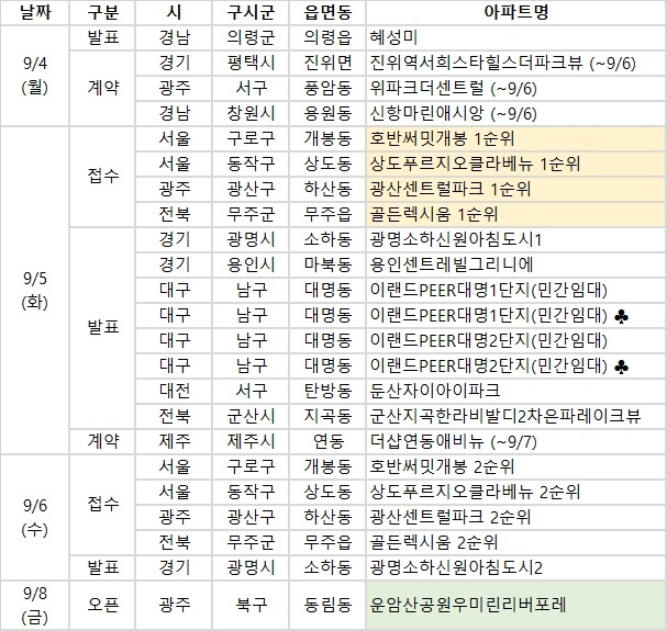 주요 분양 단지는 서울 동작구 상도동 '상도푸르지오클라베뉴', 서울 구로구 개봉동 '호반써밋개봉', 광주 광산구 하산동 '광산센트럴파크' 등이다.