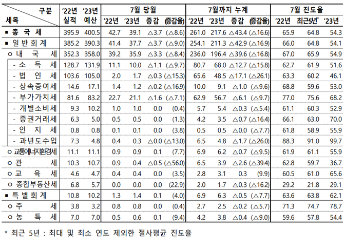 정부는 1~7월까지 43.4조원 덜 걷었다. 기준은 ‘지난해 같은 기간 대비’다.