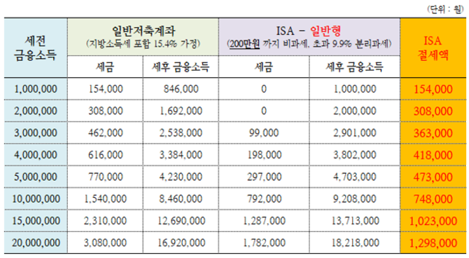 ISA의 의무가입기간은 3년 이상이고, 의무가입기간 경과 후 만기 시 계좌 내의 각 상품별·자산별 이익과 손실을 통산한 순이익(이하, 금융소득)에 대해 소득세를 과세합니다.