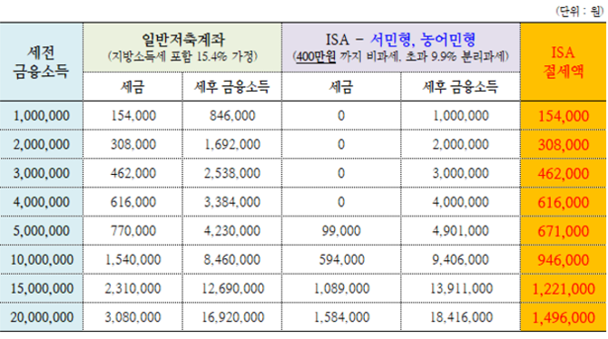 금융소득 200만 원(서민형·농어민형 400만 원)까지는 비과세하고, 200만 원(서민형·농어민형 400만 원)을 초과하는 금액에 대해서는 세율 9.9%(지방소득세 포함)로 분리과세 합니다. 만약, 만기 자금을 연금계좌로 이전하는 경우 소득세 세액공제도 받을 수 있습니다.