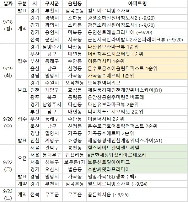 주요 분양 단지는 경기 남양주시 다산동 '다산유보라마크뷰', 부산 남구 대연동 '더비치푸르지오써밋', 울산 남구 신정동 '문수로금호어울림더퍼스트' 등이다.