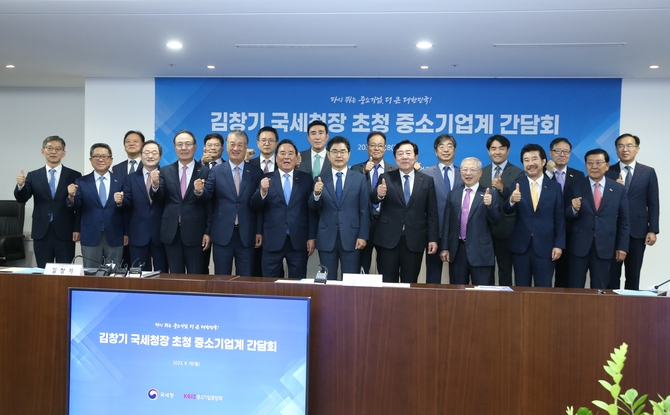 이날 간담회에는 ▲김기문 중기중앙회장 ▲윤건수 한국벤처캐피탈협회장 ▲석용찬 한국경영혁신중소기업협회장 ▲배조웅 한국레미콘공업협동조합연합회장 ▲심승일 한국고압가스공업협동조합연합회장 등 업종별 중소기업 단체장과 ▲김창기 국세청장과 국장단 등 총 20여명이 참석했다.
