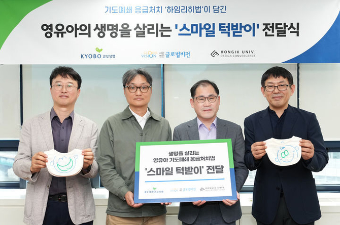 20일 교보생명은 전날 본사에서 '영유아의 생명을 살리는 총 1천개의 스마일 턱받이 전달식'을 갖고, '영유아 기도폐쇄 응급처치법 교육 캠페인'을 진행했다고 밝혔다.