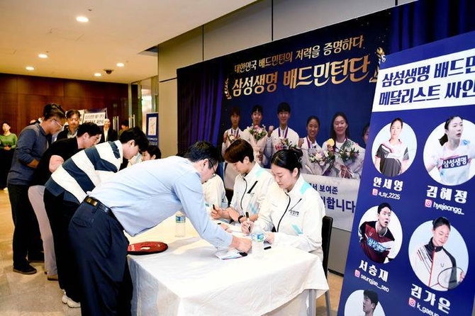 팬 사인회에는 29년 만에 여자 배드민턴 단식 아시안게임 금메달을 따낸 안세영 선수를 비롯해 아시안게임 메달리스트 5명(김가은·김혜정·서승재·김원호·강민혁)과 코치진(길영아·최정 감독, 하영웅 코치), 전영묵 대표, 박종문 자산운용부문장 사장 등이 참석했다.