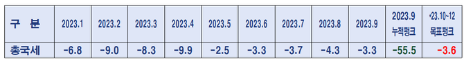 기재부가 예고한 연내 세수펑크 59.1조원을 지키려면 10~12월 동안 세수펑크 –3.6조원 선에서 방어를 해야 한다.