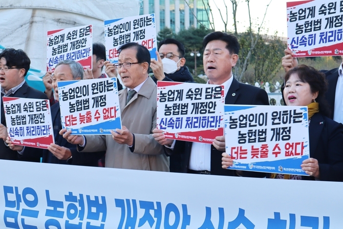 한국농축산연합회와 한국종합농업단체협의회, 축산관련단체협의회 등에 따르면 이들 단체는 지난 15일 농협법 개정안 처리를 촉구하는 내용의 규탄 성명을 냈다.