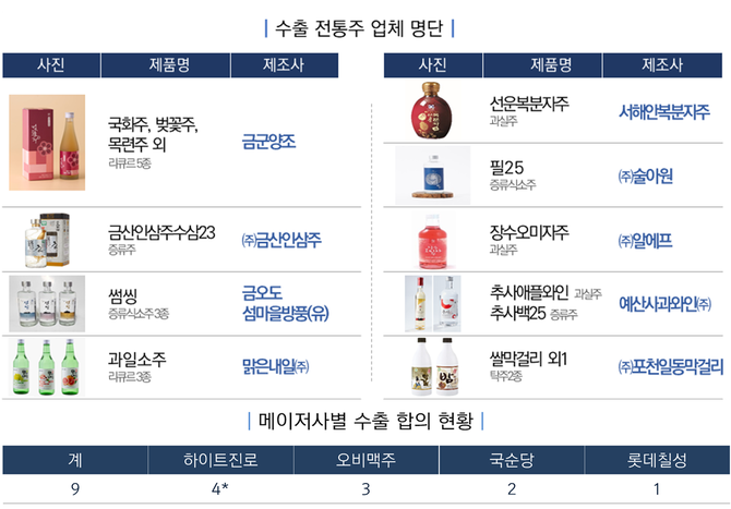 이번에 수출되는 우리 술은 장수오미자주, 금산인삼주수삼23, 필25, 추사애플와인, 국화주, 선운복분자주 등 19개 제품이다.