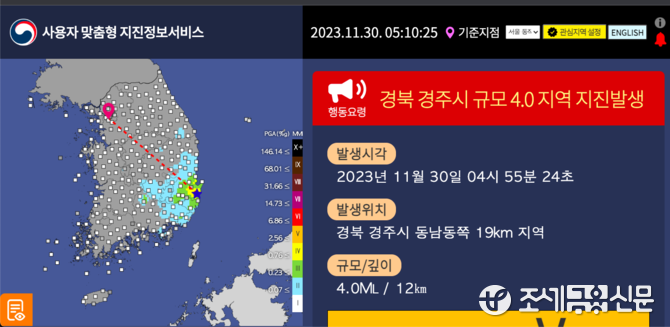 기상청은 30일 오전 4시55분 “경북 경주시 동남동쪽 19km 지역에서 리히터 규모 4.3의 지진이 발생했다”는 긴급재난문자를 전 국민을 대상으로 발송했다.