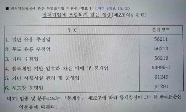 벤처기업육성특별법 시행령 제2조의 4에 의한 별표를 개정하여 블록체인 기반 암호화 자산 매매 및 중계업도 유흥주점, 카지노 같은 사행성 시설업, 무도장 운영업과 같이 벤처 기업 제외 업종으로 지정하고 있다.