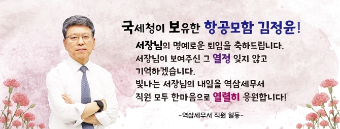 (조세금융신문=김영기 기자) "국세청이 보유한 항공모함 김정윤 서장님의 명예로운 퇴임을 축하드리며 그간 보여주신 열정을 잊지 않고 기억하겠습니다. 빛나는 서장님의 내일을 역삼세무서 직원 모두 한마음으로 열렬히 응원합니다"
