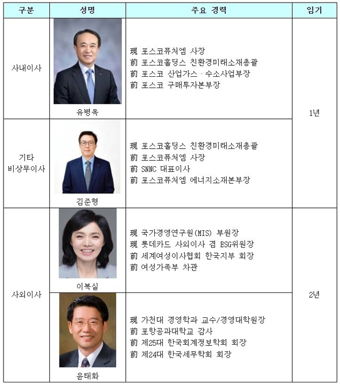 이날 이사회는 유병옥 사장을 신규 사내이사로 추천했고, 윤덕일 기획지원본부장과 최고안전환경책임자(CSEO)인 김진출 안전환경센터장을 사내이사에 재추천했다. 유병옥 사장은 1989년 포스코에 입사해 경영전략실장, 원료실장, 산업가스·수소사업부장 등을 거쳐 포스코홀딩스 친환경미래소재총괄을 역임한 그룹 내 친환경미래소재 분야 최고 전문가로서 이차전지소재사업의 지속 성장을 이끌어갈 것으로 기대된다.