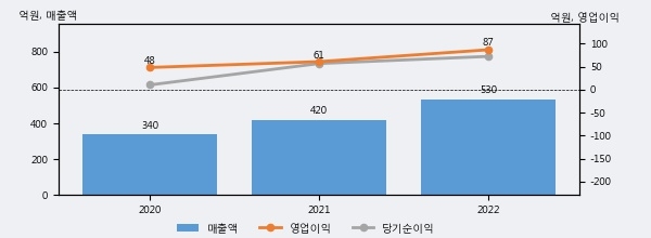 최근 실적을 살펴보면 2022년 매출액이 최근 3년 중 가장 높은 실적을 기록했음을 알 수 있다. 이전 최고 실적이었던 2021년 보다도 26.2%(110억 2천만원) 늘어난 것으로 나타났다.