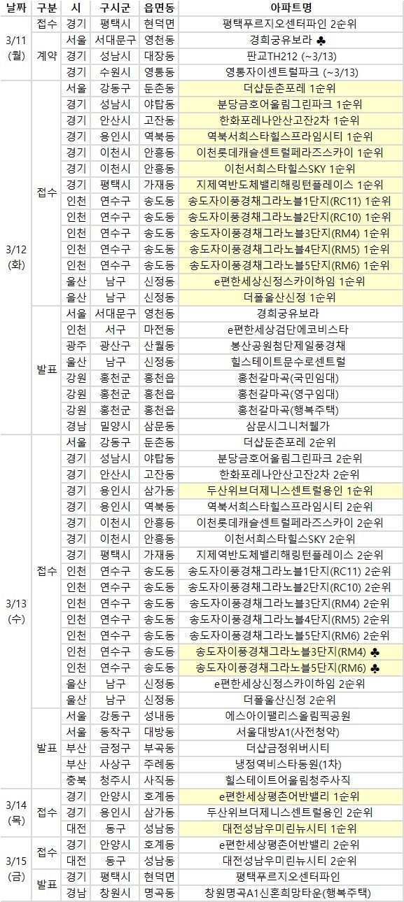 주요 분양 단지는 서울 강동구 둔촌동 '더샵둔촌포레', 인천 연수구 송도동 '송도자이풍경채그라노블', 경기 이천시 안흥동 '이천롯데캐슬센트럴페라즈스카이', 경기 평택시 가재동 '지제역반도체밸리해링턴플레이스' 등이다.
