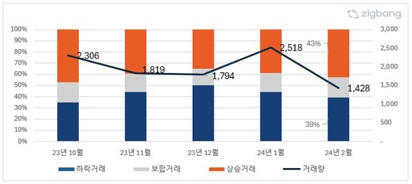 11일 종합 프롭테크 기업 직방이 국토교통부 실거래가 공개시스템에 공개된 서울 아파트 매매를 분석한 결과 1월(2518건) 반짝 회복세를 보였던 시장과 달리 지난달(1428건) 다시 거래량이 줄어든 것으로 나타났다. 다만 지난해 말부터 저가 매물 소진 영향으로 2월 상승 거래 비중은 43%를 나타내며 하락 거래 39%와 비교해 소폭 증가한 것으로 집계됐다.