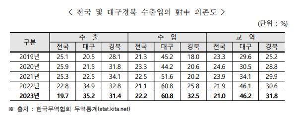 지난달 2월 한국무역협회 대구경북지역본부가 발표한 대구·경북 수출입의 대중국 의존도 분석 보고서에 따르면 지난해 전체 수출에서 중국이 차지하는 비중은 대구 35.2%, 경북 31.4%다.