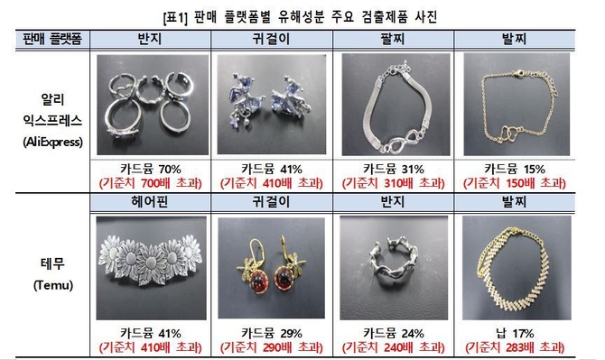 관세청 인천세관은 7일 최근 이용자가 급증하고 있는 중국 해외직구플랫폼(알리익스프레스, 테무)에서 판매 중인 초저가 장신구 제품(귀걸이, 반지 등) 404점의 성분을 분석한 결과, 그 중 96점(24%)의 제품에서 국내 안전 기준치를 초과하는 카드뮴, 납 등의 발암물질이 검출됐다고 밝혔다.