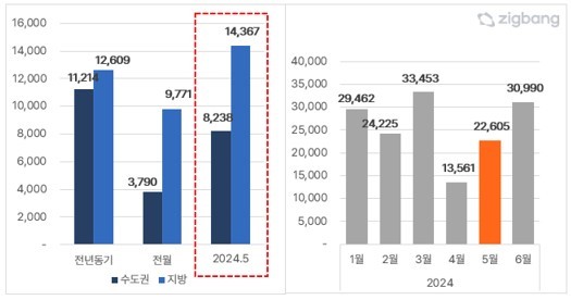 작년 같은 달(2만3803가구)과 비슷한 수준이지만, 입주 물량이 적었던 지난달(1만3561가구)에 비해서는 67%(944가구) 늘어난 것이다. 지난 달 입주물량이 다소 적어 5월 물량 증가에 대한 체감이 크다는 게 직방측 설명이다.