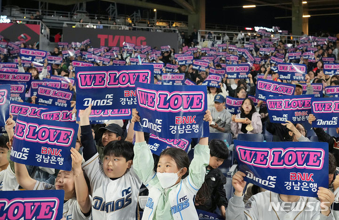 특히 초청된 지역 기업체 임직원 가족과 BNK경남은행 임직원은 'We Love NC 다이노스, BNK경남은행' 문구가 적힌 피켓을 들고 퍼포먼스를 펼치기도 했다.