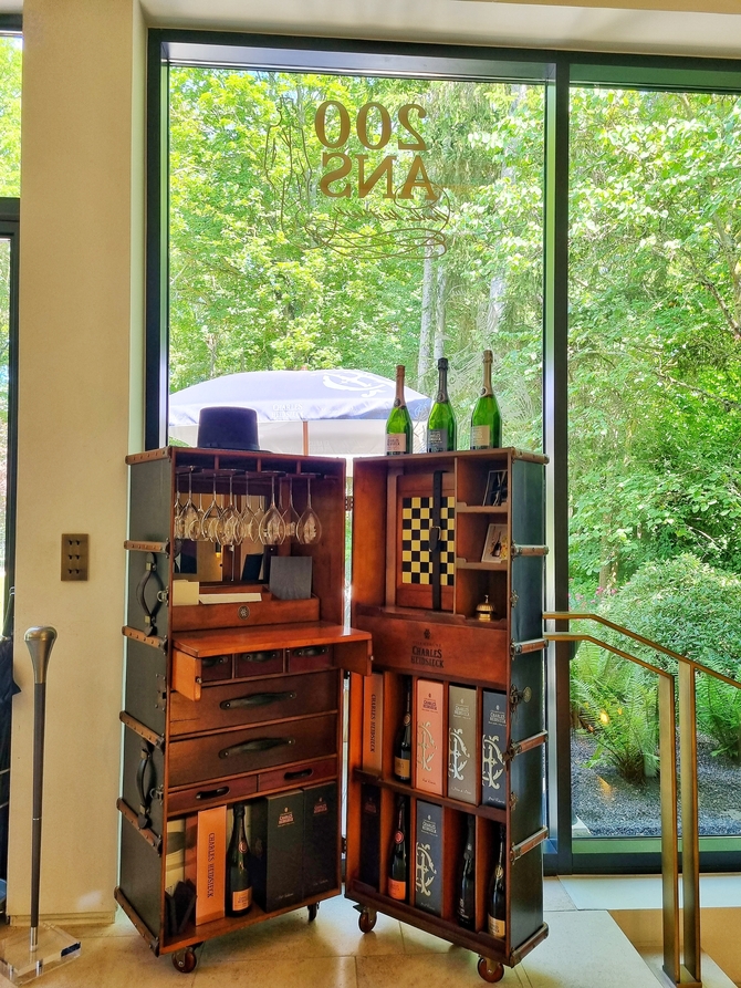 셀러 투어를 마치고 테이스팅을 위해 룸으로 자리를 옮겼습니다. 찰스 하이직의 역사를 느낄 수 있는 여행 케이스가 전시되어 있어서 잠시 동안 170년 전 미국으로 항해를 떠나는 기분이 들었습니다. 자리에는 작은 선물과 테이스팅을 위한 잔이 세팅되어 있습니다.