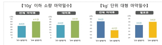 지난해 상반기와 비교해 보면 국제우편 경로의 적발 건수는 28% 증가한 반면, 적발 중량은 40% 감소했는데 이는 자가 소비 목적으로 추정되는 소량의 마약밀수가 증가한 것을 원인으로 봤다.