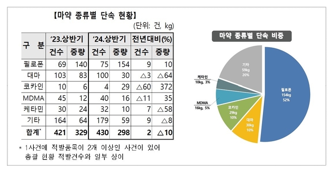 (조세금융신문=안종명 기자) 올해 상반기 마약류 적발 건수가 지난해 동기대비 11% 증가한 반면, 적발 중량은 10% 감소한 수치를 보였다.