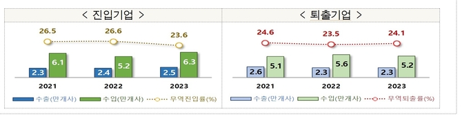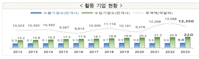 다만 무역액은 2022년의 1조 3588억 달러에 이어 두 번째로 많은 수준으로 나타났다. 무역 활동 기업 수는 26만 3421개사로 4.8% 증가해 역대 최대치를 기록했다.